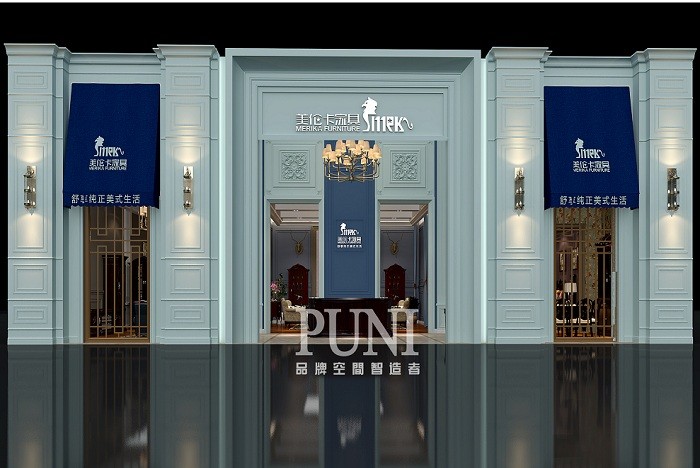 美伦卡家具有限公司创办于2007年,一家集设计、生产、营销与一体的现代化家具制造大型企业。公司引进国内外先进生产设备,保障了高品质的家具标准制造流程,将现代经营体系与自身发展条件相结合,实施科技化、标准化、人性化的管理制度。美伦卡家具自成立以来,秉承以“顾客至上、品质至上、诚信至上”的企业文化,以缔造家具行业标杆名企为雄心,以诚信的品质及雄厚的企业实力获得国内外客户的赞誉! 美伦卡家具展台设计采用了上个世纪的欧式古堡设计,外观以青蓝色为主,配合美伦卡家具品牌logo的旗帜、接待台,整体感觉古典、庄严;内部由两房一厅的家具展示区组合而成。