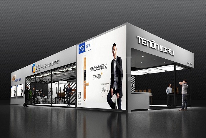 广东亚太天能科技股份有限公司成立于2011年,旗下品牌:亚太天能、TENON。公司集指纹锁研发、生产、销售与服务为一体的专业供应商,拥有生物类指纹识别、密匙传感、射频交换、核心锁体、智能联网、嵌入式数字芯片等尖端技术,是国家认定的高新技术、软件企业,指纹锁、智能家居、智能遥控、指纹智能门等配套产品,是国用防盗系统车用智能锁提供商,双向汽车防盗系统,销售网络遍布全球。 亚太天能展台设计以银白色为主色调,外搭亚太天能logo、文字与宣传海报,内置接待台、两个大型产品展示区域、三个洽谈区组合而成。银白色的展台设计让人感觉干净舒畅,阔大的空间、合理的布置让客户记忆犹新。