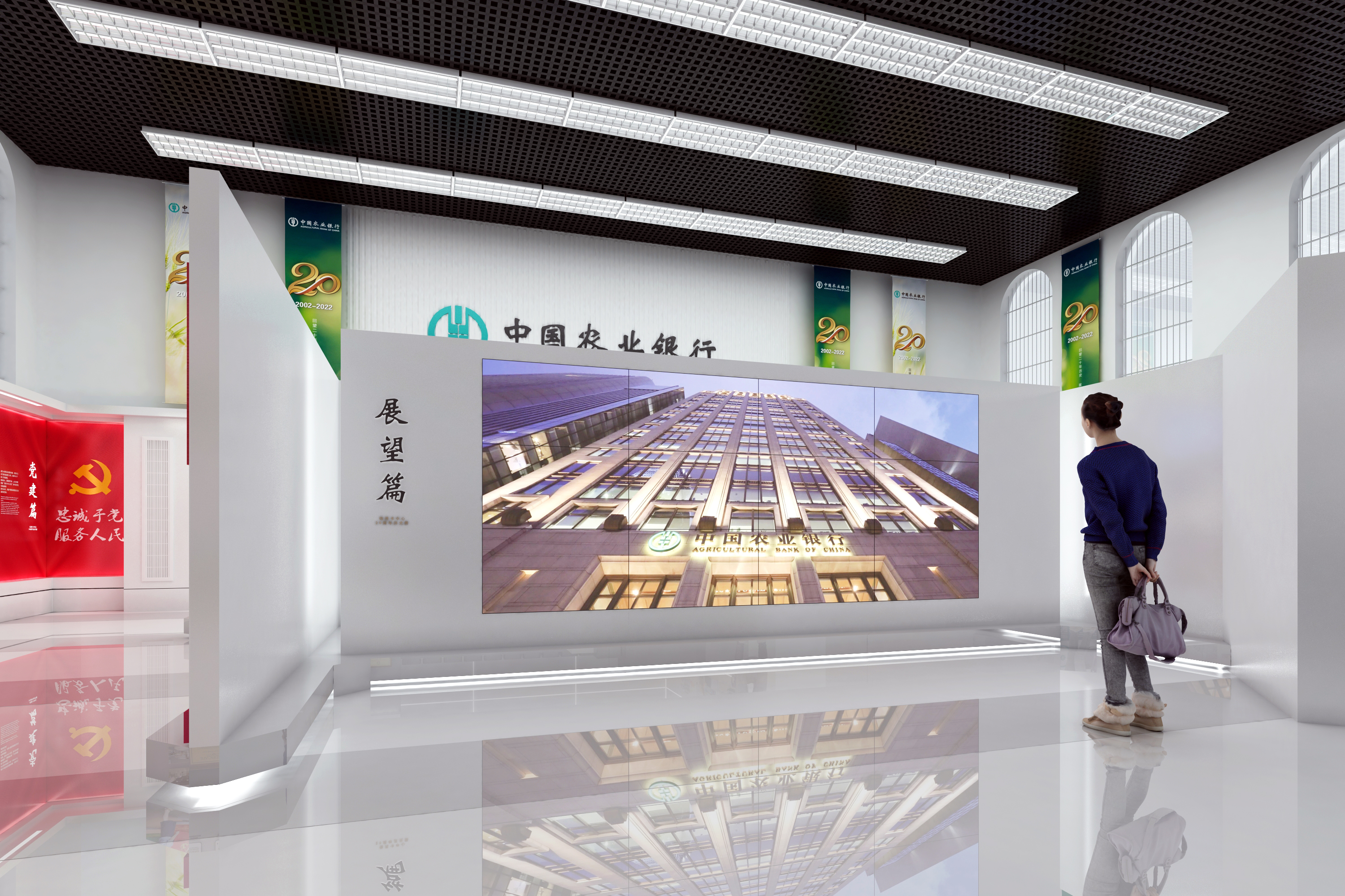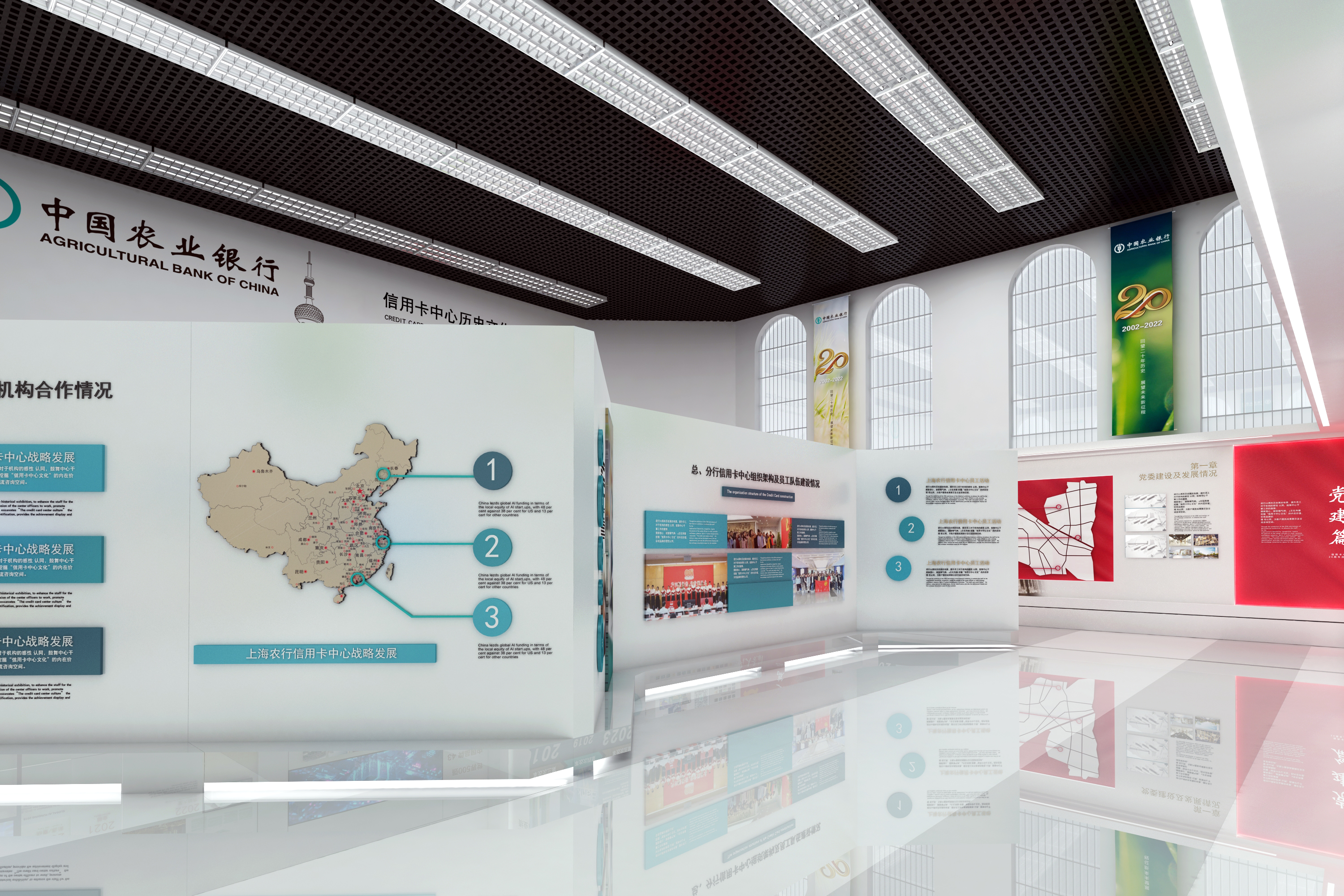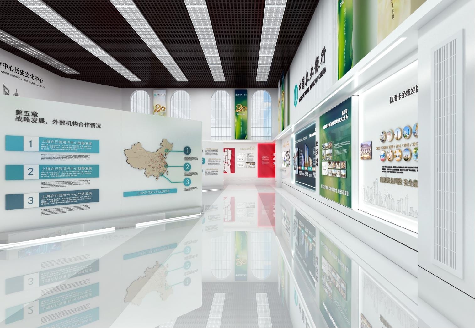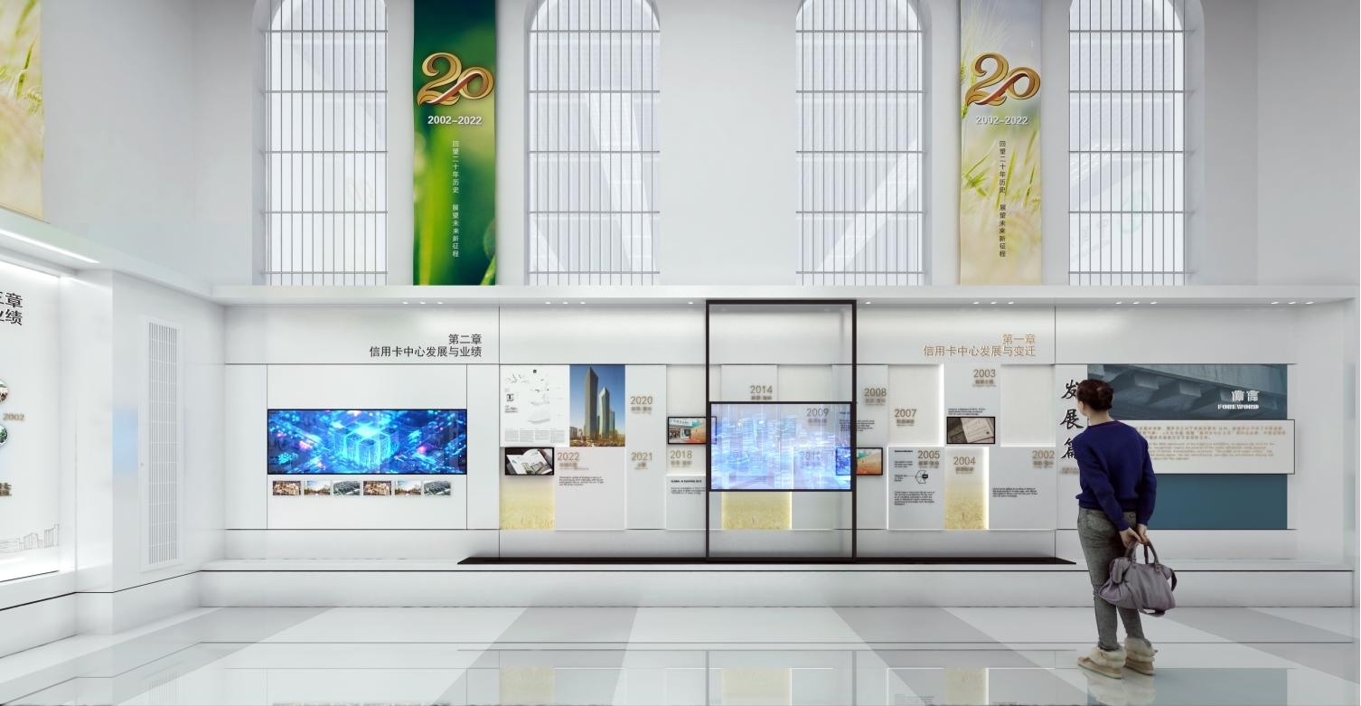 2022年是信用卡中心成立20周年,按照“尊重历史、突出重点、展示特色、合理利用”的原则,客观、全面展示信用卡中心20年发展、壮大的历程及成就的主旨。该中心共分为6个篇章:发展篇、改革篇、文化篇、党建篇、荣耀篇、风采篇,通过形式多样的展览宣传,满足全行信用卡条线员工回顾信用卡历史文化、汲取精神营养需求,为未来信用卡业务发展提供思想保证和精神动力。