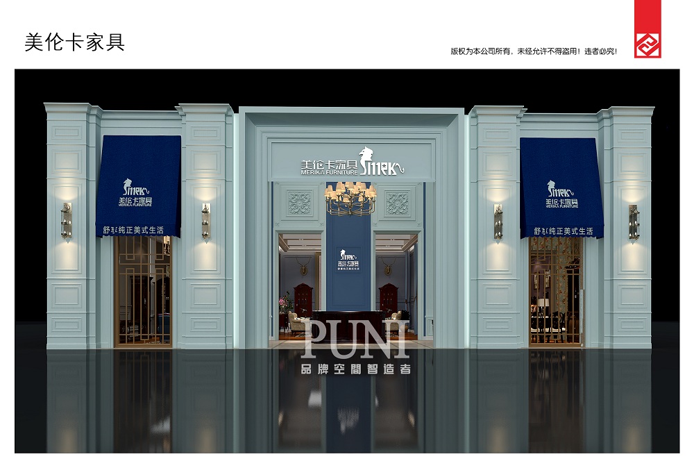 美伦卡家具有限公司创办于2007年,一家集设计、生产、营销与一体的现代化家具制造大型企业。公司引进国内外先进生产设备,保障了高品质的家具标准制造流程,将现代经营体系与自身发展条件相结合,实施科技化、标准化、人性化的管理制度。美伦卡家具自成立以来,秉承以“顾客至上、品质至上、诚信至上”的企业文化,以缔造家具行业标杆名企为雄心,以诚信的品质及雄厚的企业实力获得国内外客户的赞誉! 美伦卡家具展台设计采用了上个世纪的欧式古堡设计,外观以青蓝色为主,配合美伦卡家具品牌logo的旗帜、接待台,整体感觉古典、庄严;内部由两房一厅的家具展示区组合而成。