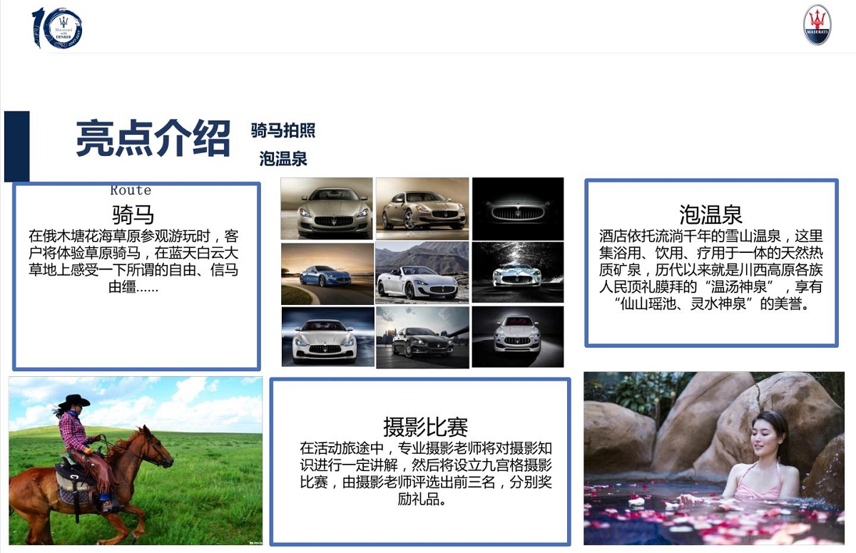 1914年12月1日,阿尔菲力玛莎拉蒂公司在意大利博洛尼亚诞生。此后,玛莎拉蒂在跑车文化的发展历程中始终占据举足轻重的地位。一个世纪以来,玛莎拉蒂无论在公路还是赛道上都取得了辉煌成就,也度过了一次次困境。以往的重重挑战,造就了公司坚韧鲜明的品质和个性。三叉戟是这一传奇的化身。玛莎拉蒂历史上的所有赛车都镶有三叉戟标识。这一徽标历经玛莎拉蒂的风格变迁、技术创新和性能,见证品牌的辉煌历程。骏佳集团总部设于香港,于汽车行业拥有30多年经验,集团始于1978年,当时主要于香港销售各国知名品牌之汽车及其零配件,并提供完善的售后服务。后来,随着国内经济不断开放及发展,公司于1998年开始在中国各个保税区发展内地业务,直至1999年开展3S经销店,成为中国第一批3S品牌代理商。累积多年经验,骏佳集团现已成为中国领先的全国汽车经销商集团之一,集团在国内市场建立良好的声誉,市场占有率不断增加,核下之经销店网络现正不断发展和壮大,业务遍及国内多个省市。
